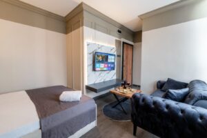 Premium konfor arayanlar için tasarlanmış süit odamız. Ayrı yatak odası ve şık oturma alanıyla iş ve dinlenme ihtiyaçlarınızı karşılar. Ücretsiz Wi-Fi, klima ve Netflix, YouTube dahil dijital platformlara erişimli smart TV bulunmaktadır. Panoramik şehir manzarası, premium yatak takımları ve özel oda servisi hizmetiyle Arena Luxury farkını yaşayın.